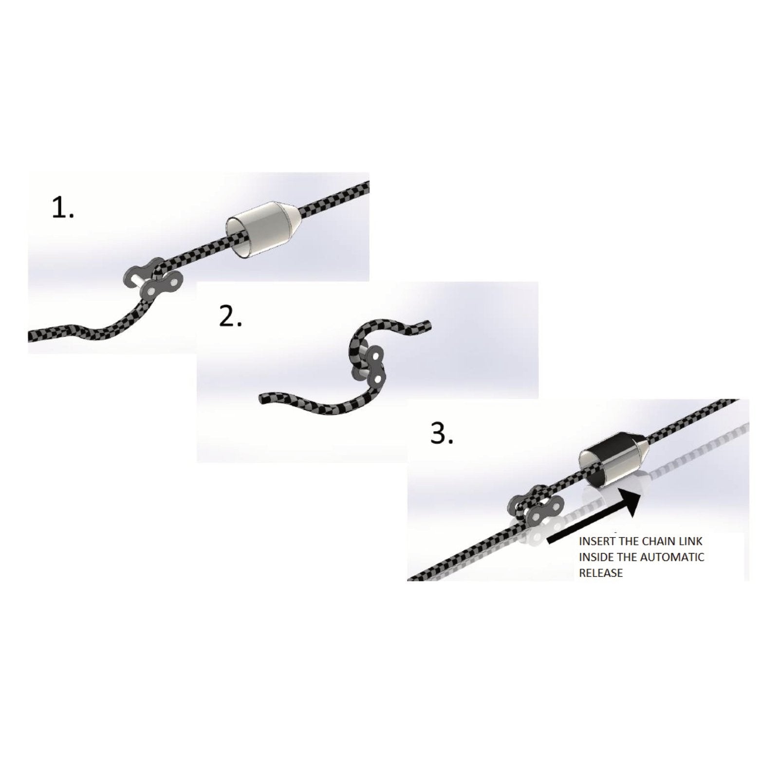 The automatic release is used to free the rope from the pulley at the right moment to allow the log to finish its path parallel to the trail, without having to interrupt the operation to remove the rope from the pulley. When the trigger hits the open-face pulley, its diameter ejects the rope, allowing the log to pivot along the trail and continue its path straight toward the winch or pulling vehicle.