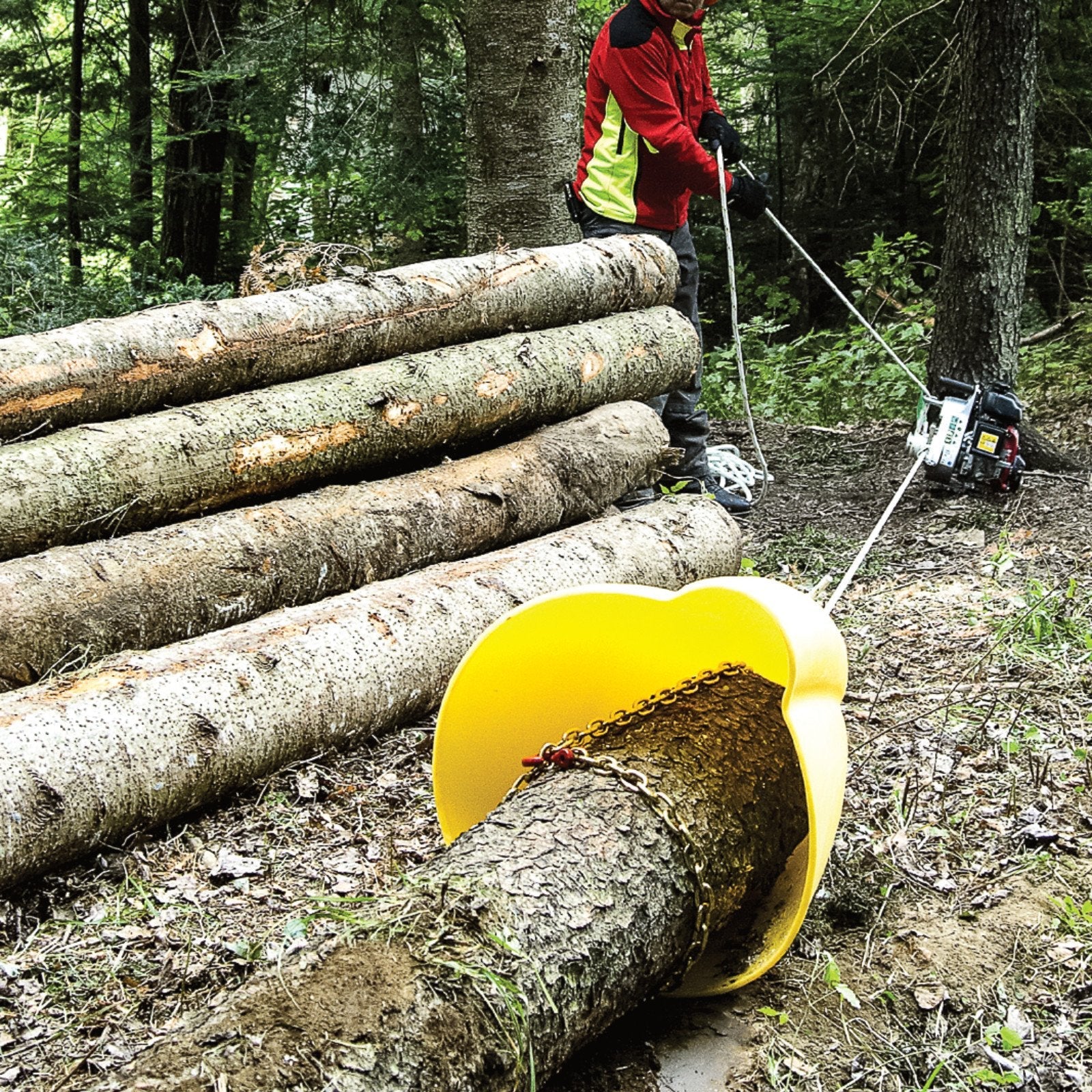 These 2 chokers are 7 feet long, allowing a 20'' diameter tree to be encircled while keeping a sufficient length to thread it into the nose of the skidding cone. They also both feature a 12'' steel rod at one end to easily pass it under the logs and through the opening of the skidding cone.