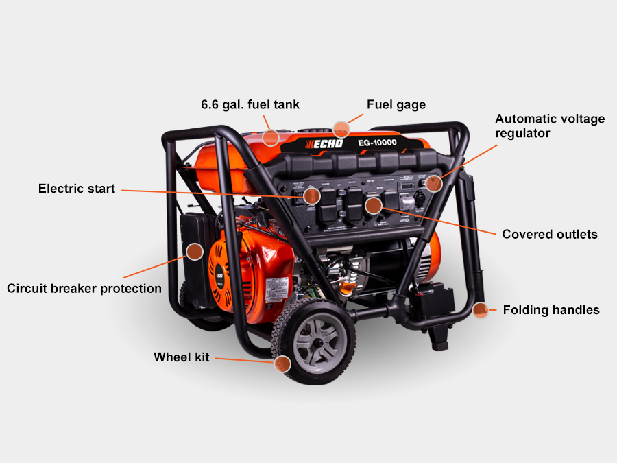 Major output for major needs. The EG-10000 generator runs quietly and is capable of efficiently producing 10,000 watts, enough to power large loads like jobsites, multiple home appliances, and food trucks. An automatic voltage regulator also maintains constant power.
