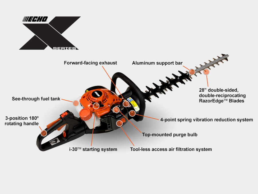 Powerful, precise, and professional. The best-in-class HC-2810 hedge trimmer starts easily and delivers smooth performance to give an attractive, inviting shape to overgrown hedges and bushes. Laser-cut, double-reciprocating 28-in. RazorEdge® blades provide clean cuts and long-lasting sharpness.