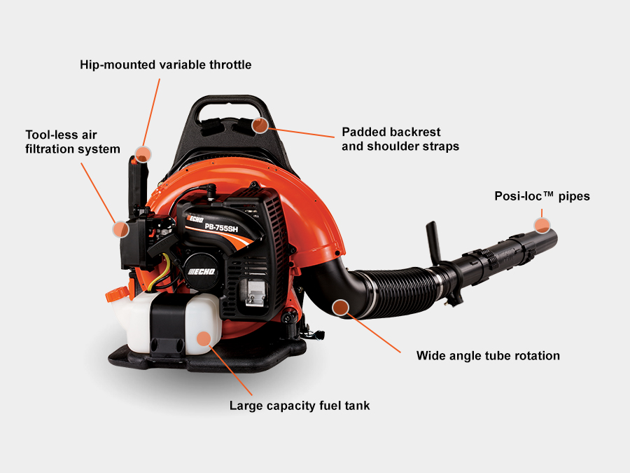 The PB-755SH backpack blower with hip-mounted throttle pushes 651 CFM at 233 MPH. With easy maintenance and ergonomic designs for all-day comfort, it makes the toughest cleanups a breeze.