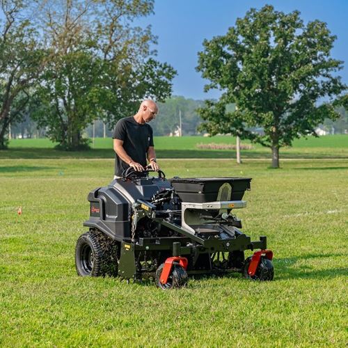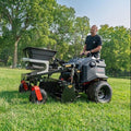 Our Z Turf Equipment Z-Aerate family of stand-on aerators turns a hard, time-intensive process into quick work. Our commercial aerators have zero-turn capabilities, making it easy to maneuver around flowerbeds, trees, and other landscaping. An intuitive control panel is easy to operate while precisely controlling the aerator. The commercial-grade aerator engines allow landscape professionals to reach up to 10 mph to aerate 3 acres per hour. Designed with comfort in mind, the Z- Aerate's full floating platform adjusts to the operator's weight, reducing fatigue so you can get more done. The 150-lb hopper attachment turns this aerator into a 2-in-1 machine that aerates and overseeds simultaneously.